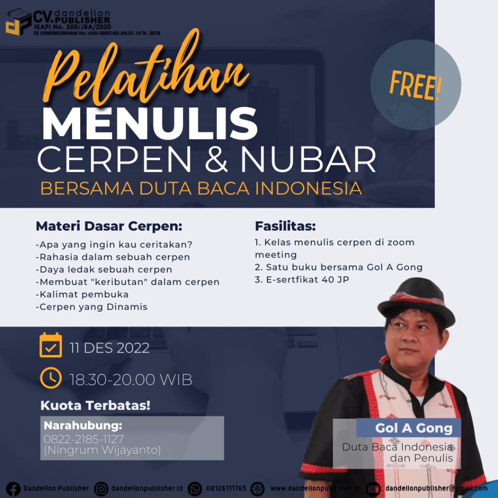 Kami mengundang para cerpenis untuk mengikuti materi seputar cerpen yang diberikan oleh Mas Gol A Gong (Duta Baca Indonesia, Penulis Novel Balada Si Roy serta 125 buku lain).